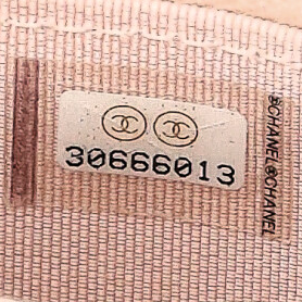 8-stellige Nummer auf weissem Sticker mit klarer Folie und zwei Chanel Logos. "X" Schnittmarken verhindern ein spurloses enfernen des Stickers. CHANEL steht auf der rechten Seite. Dunkle Linien auf der linken Seite. Der Sticker ist gold gesprenkelt.