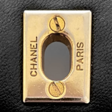 Die Schliesse ist auf der Rückseite oben und unten immer mit 2 flachen Schrauben befestigt. Links auf der Schliesse liest man CHANEL und rechts PARIS. Die Schrift ist gleichmässig und gut lesbar.