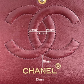 Das CHANEL Logo ist 3.3 cm breit und 1.5 cm unter dem eingesteppten CC im Inneren der Tasche platziert. Beim Logo im Inneren der Tasche, oft auf der Innenseite der inneren Flap, ist die Breite der Cs gleich gross wie der Abstand zwischen den beiden Cs und entspricht 0.9 cm.