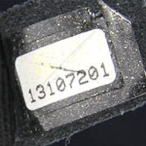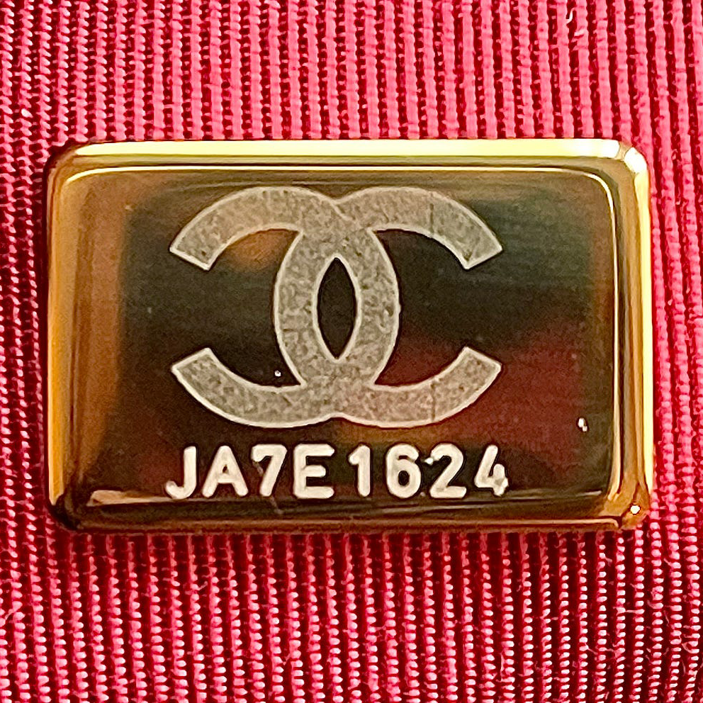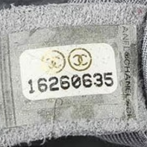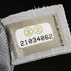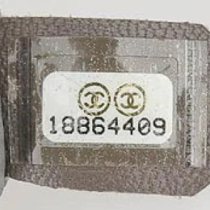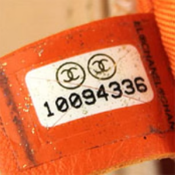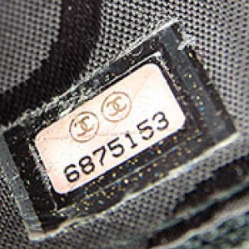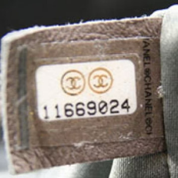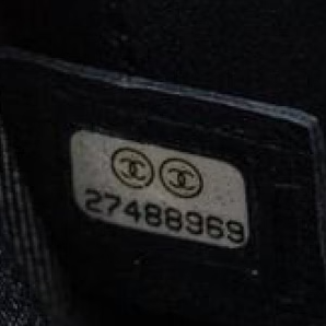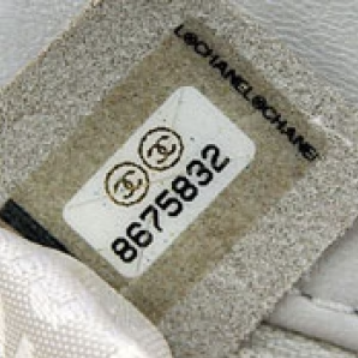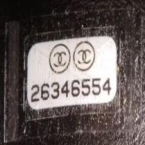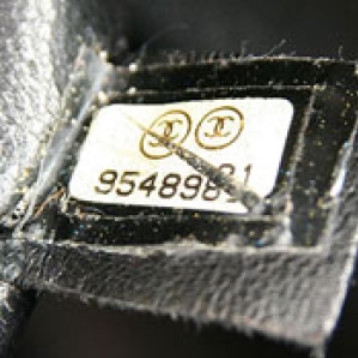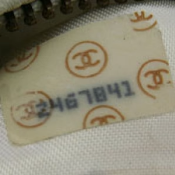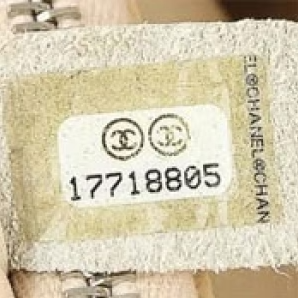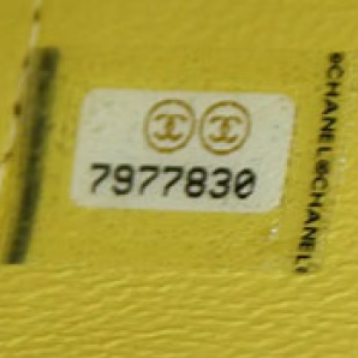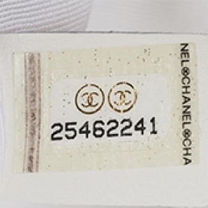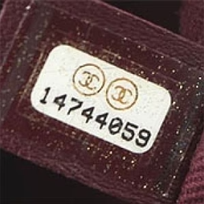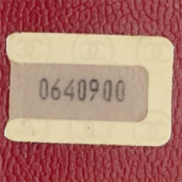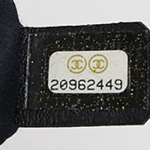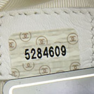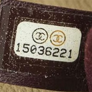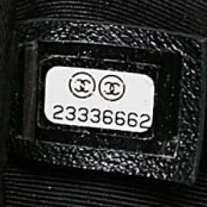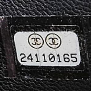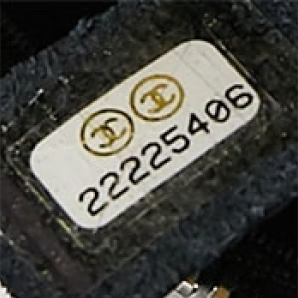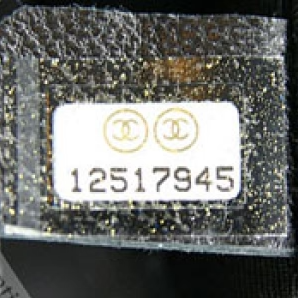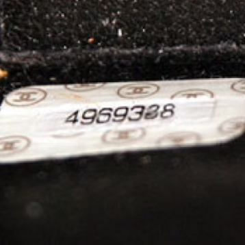 7-stellige Nummer auf weissem Sticker mit klarer Folie und zwei Chanel Logos. "X" Schnittmarken verhindern ein spurloses enfernen des Stickers. CHANEL steht auf der rechten Seite. Dunkle Linien auf der linken Seite. Der Sticker ist gold gesprenkelt.
