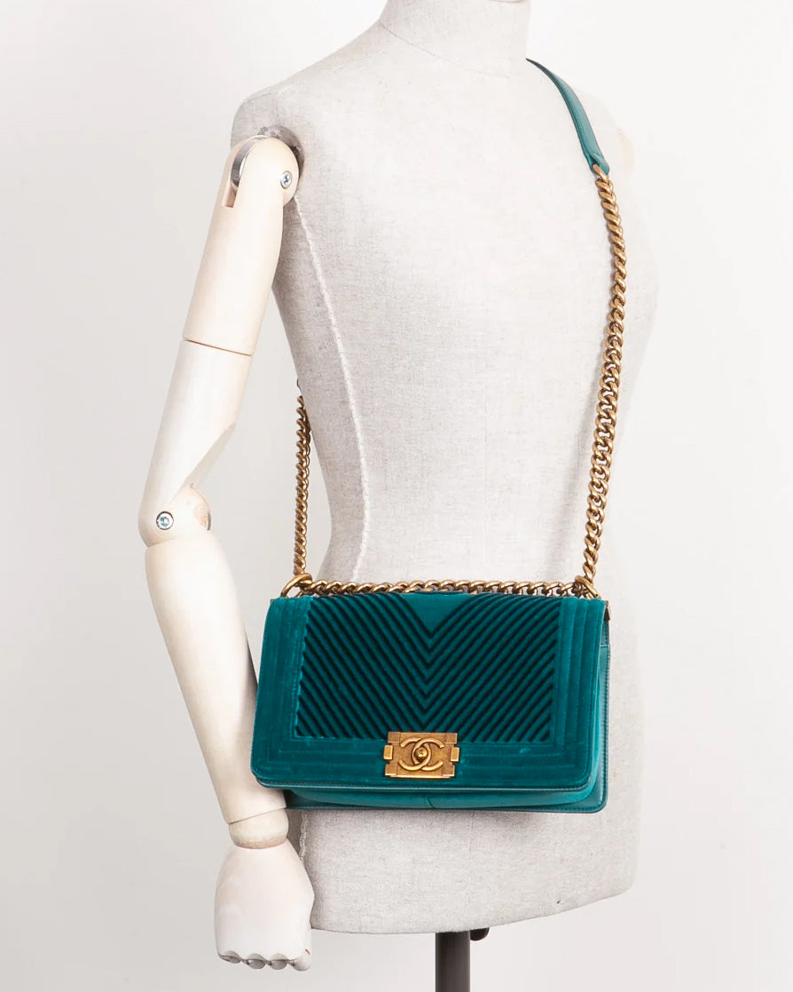 Die Boy-Tasche weist ähnliche Merkmale wie die 2.55 auf, ist jedoch kastenförmiger und ihre Hardware ist eher in Gunmetal gehalten. Sie ist von einer Patronentasche inspiriert, die für Jäger gemacht ist. Die Boy Bag richtete sich an eine jüngere Generation von Fashionistas: ein androgyner Stil, der Cocos bahnbrechende maskulin-feminine Ästhetik feiert.