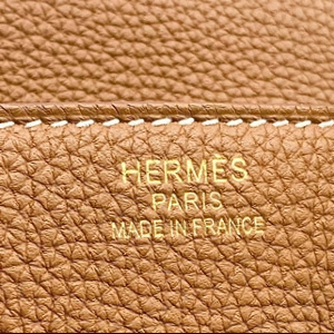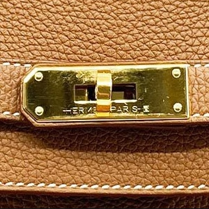Die Hardware der Kelly und Birkin ist aus hochwertigem Metall hergestellt. In der Regel ist sie entweder 18k vergoldet oder aus Palladium. Goldfarbenes Metall mit einem Stempel neben der HERMES PARIS Gravur ist mit 24k vergoldet.