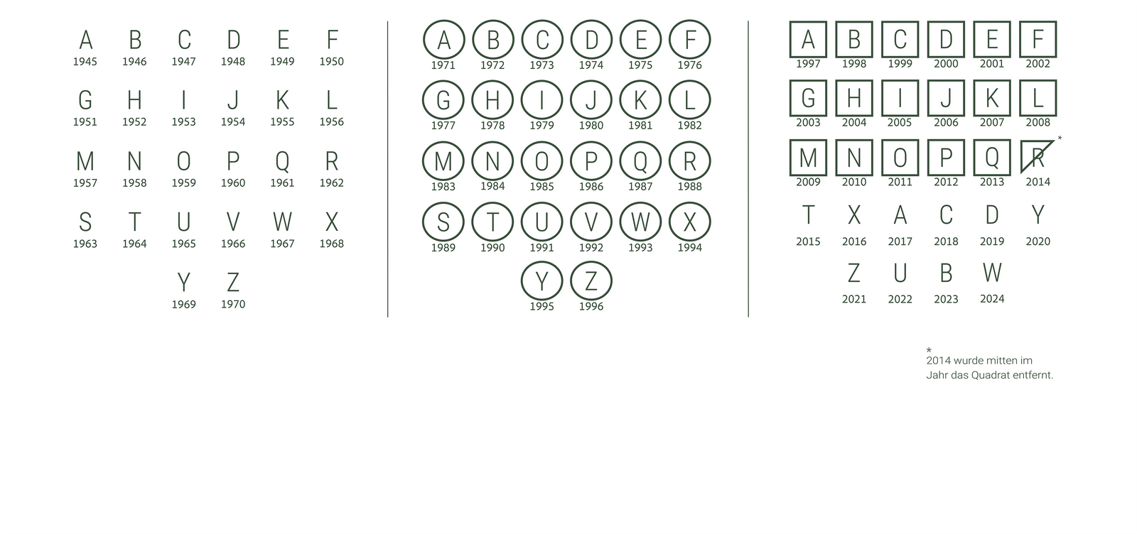 Alle Hermès Lederprodukte tragen eine Blindprägung. Hermès datiert die Handtaschen anhand von Grossbuchstaben. Seit 1971 verwendet Hermès Buchstaben und Formen um das Jahr zu kennzeichnen. Dies ist entweder ein Kreis oder ein Quadrat. Modelle die ab 2014 produziert wurden, weisen wiederum nur den Buchstaben auf.