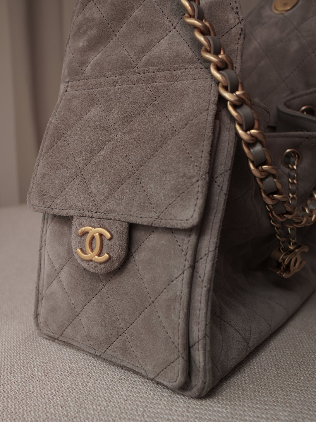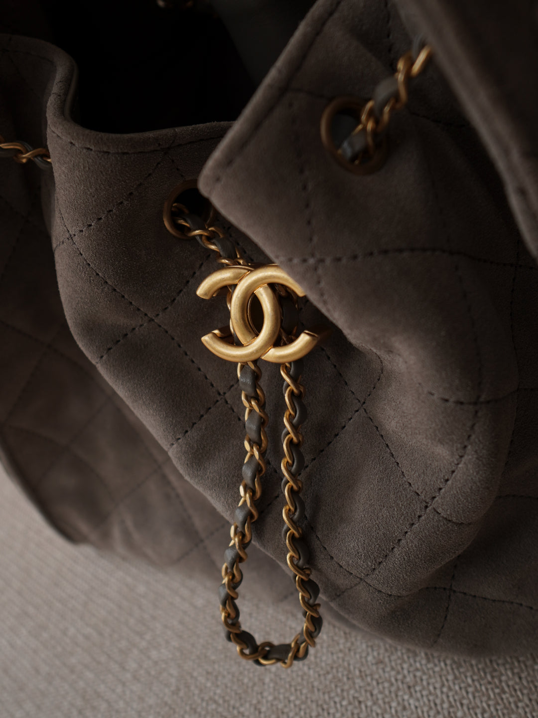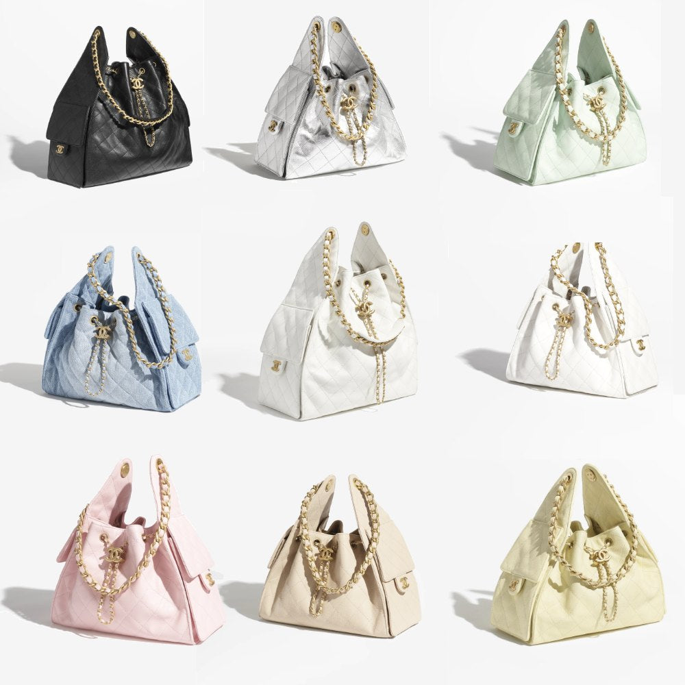 Gesteppte Lederflächen, Kettenelemente und das ikonische CC-Detail greifen die bekannten Codes des Hauses Chanel auf. Der Kordelzugverschluss sorgt für einen sicheren Verschluss bei gleichzeitig stilvoller Optik.