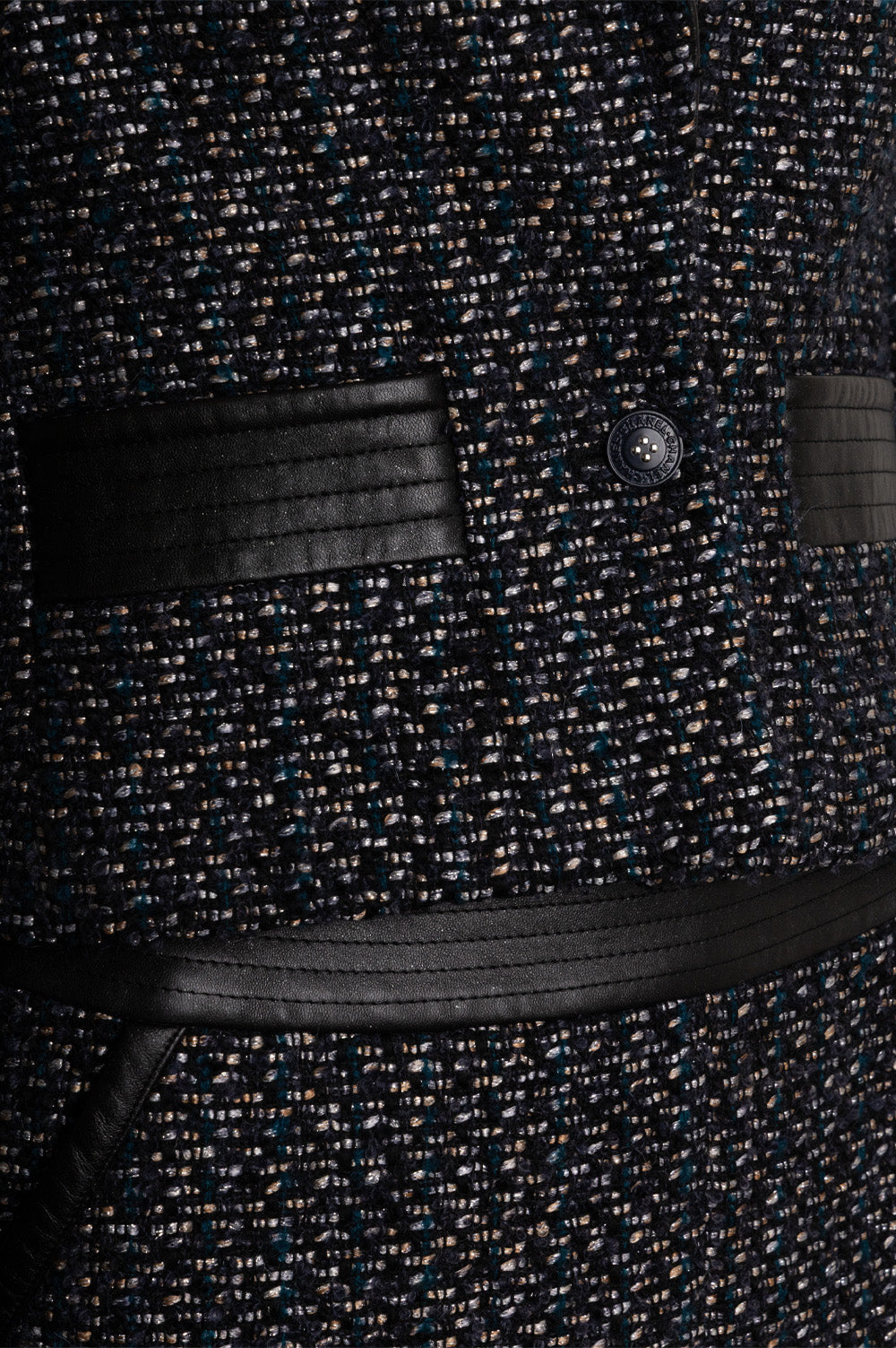 CHANEL 2002 Tweed Leather Detail Two Piece Black Blue