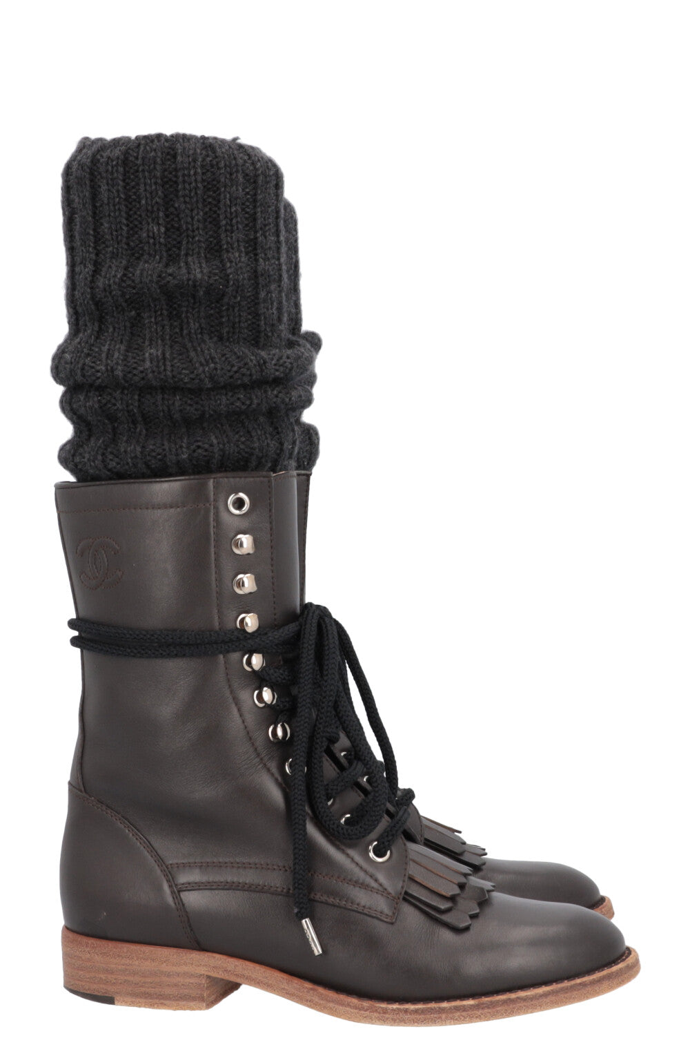 We Love: Dieser schöne Combat Boot vereint Leder und Strick mit einem Flair, wie wir es von Chanel kennen und lieben. Der dunkle Braunton, wie Zartbitter Schokolade, hat es uns besonders angetan.