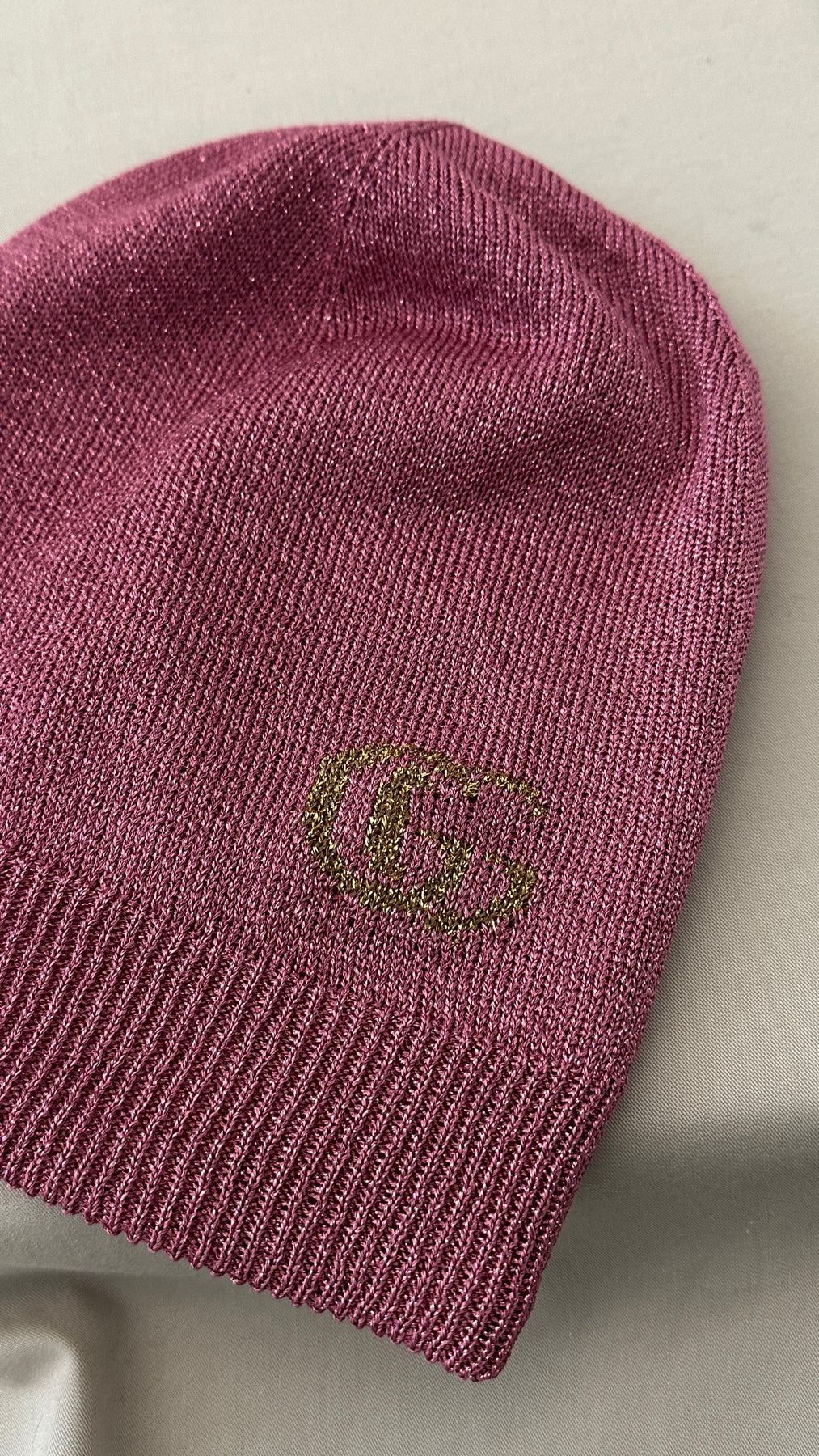 Marmont Strickmütze in Rosa mit Lurex-Finish und ikonischem GG-Detail. Weich, glanzvoll und perfekt für kühle Tage.